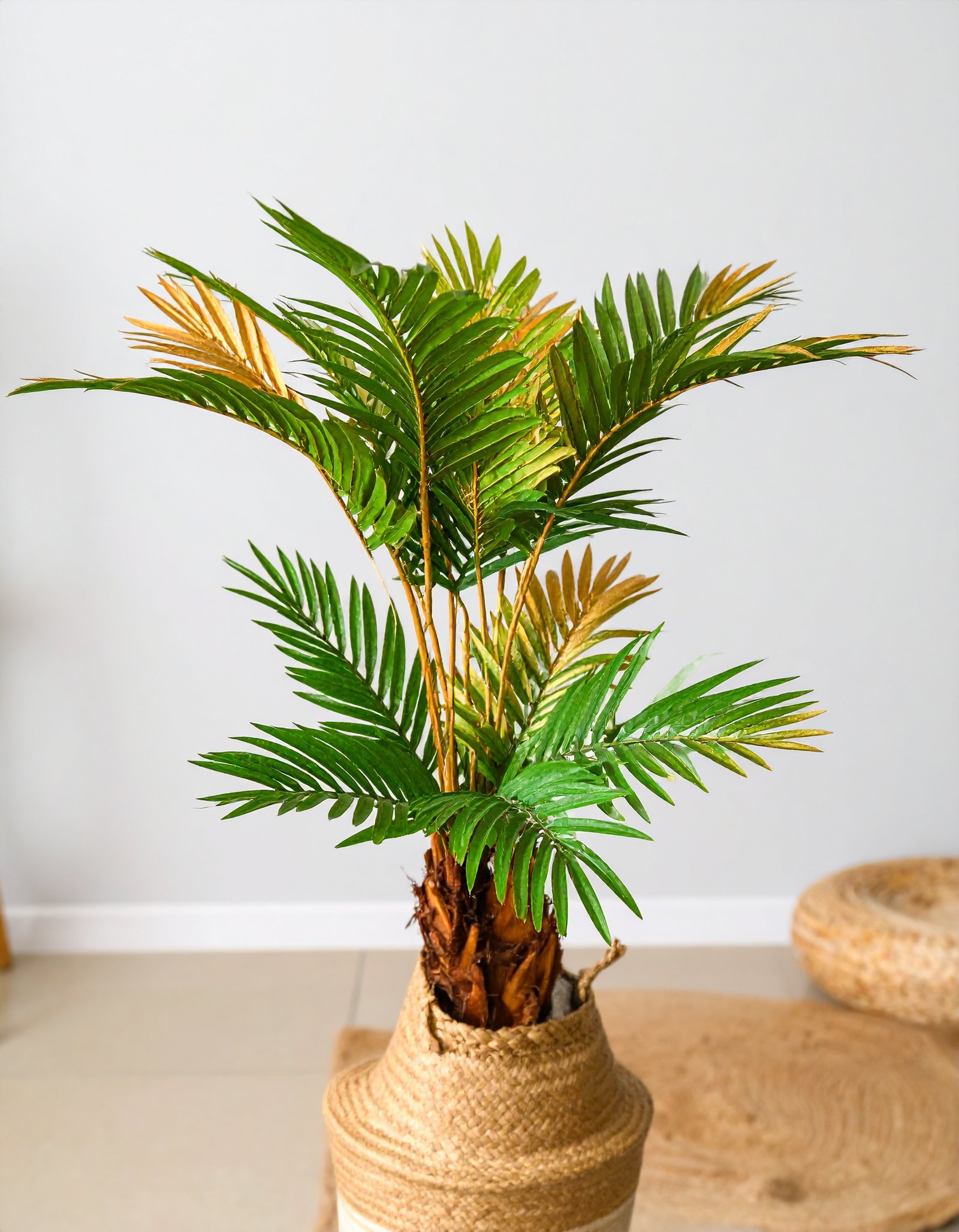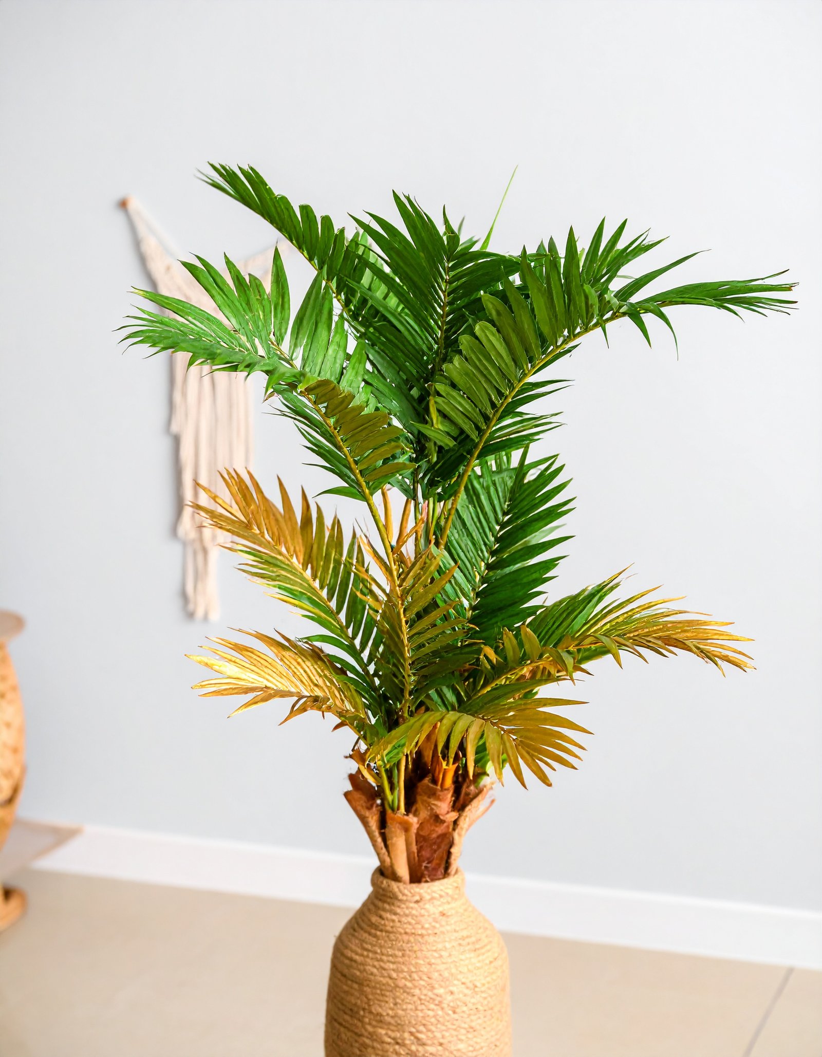Bring tropical elegance indoors with this 3 Ft Golden Palm Tree, featuring 12 gracefully arching leaves across 4 sturdy stems—a radiant, low-maintenance décor addition.