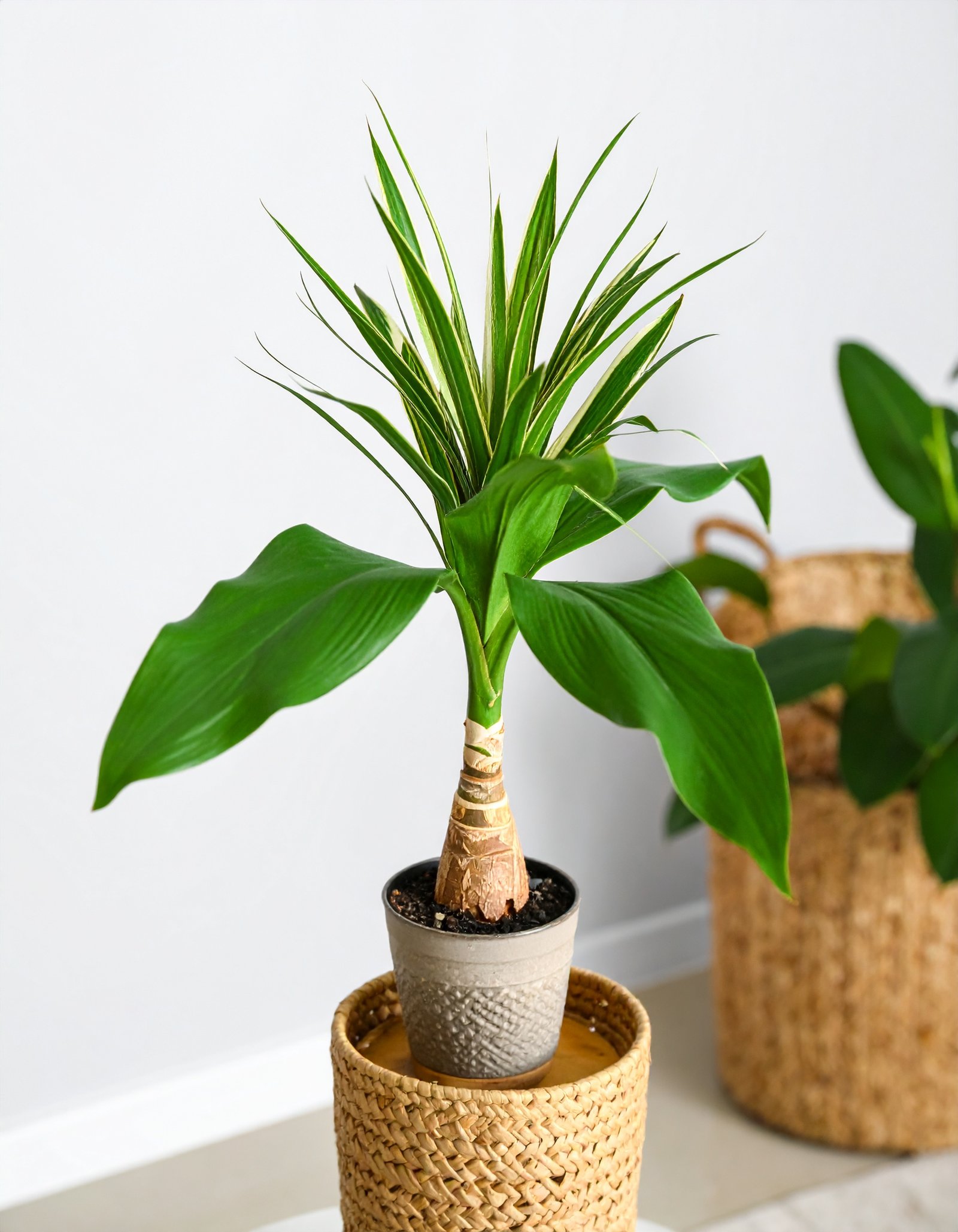 A 105CM tall artificial Dracaena plant featuring Real Touch green and white leaves with a uniquely shaped bottle trunk—adds elegant greenery to any indoor space without the upkeep.
