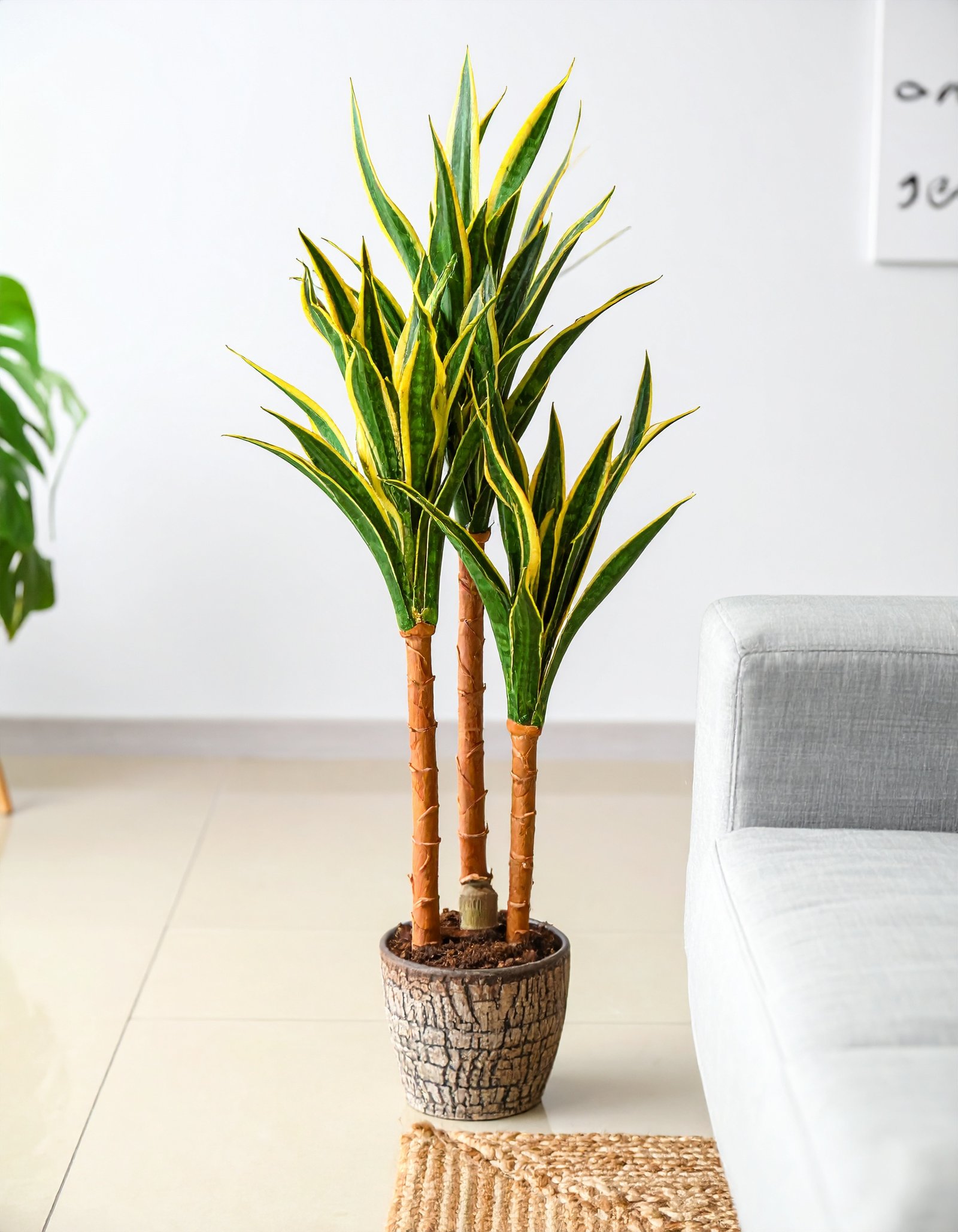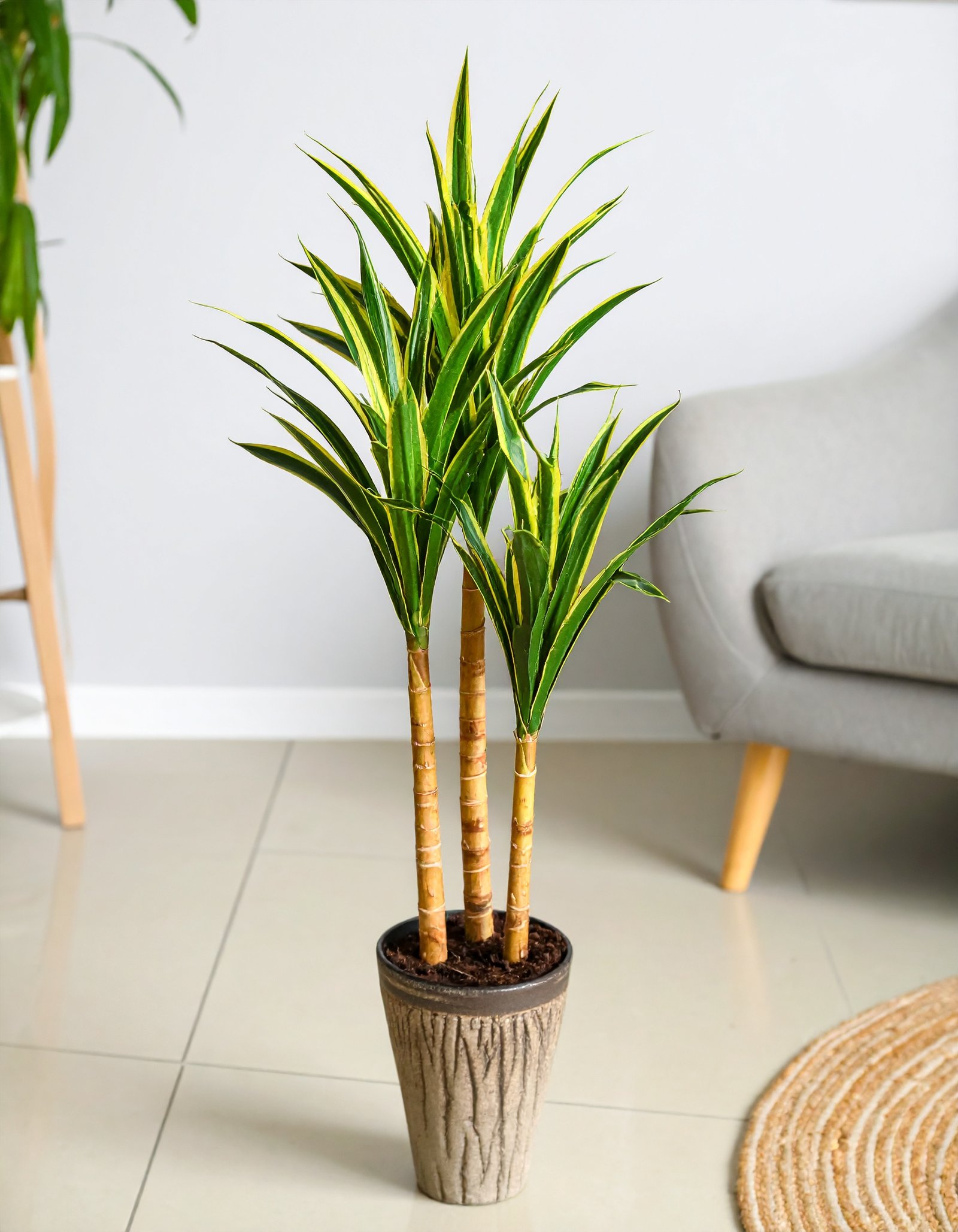 Add a touch of tropical charm to your space with this 150CM tall 3-in-1 artificial Dracaena plant. Features green and yellow Real Touch leaves and a natural-looking fibre trunk—zero maintenance, 100% style.