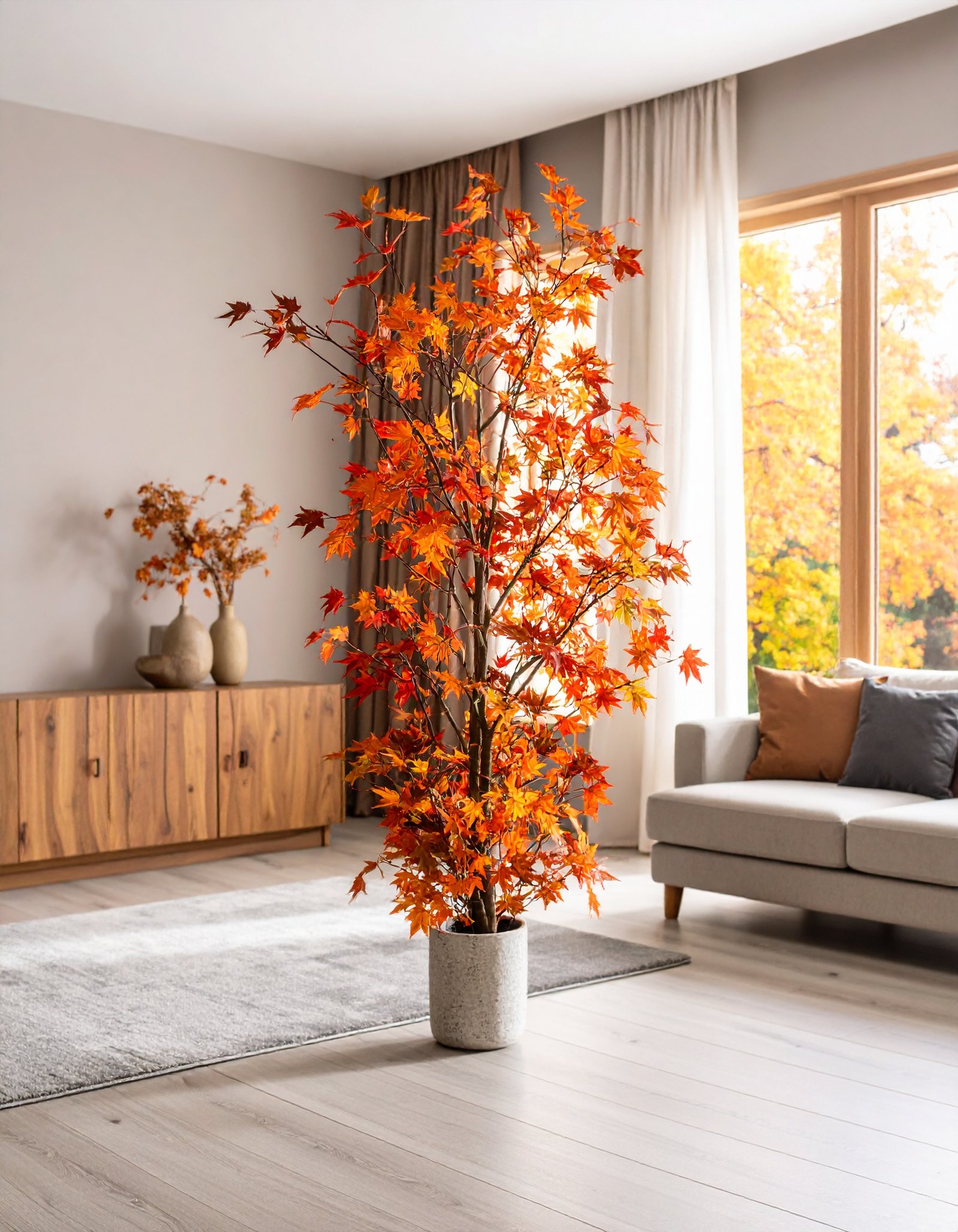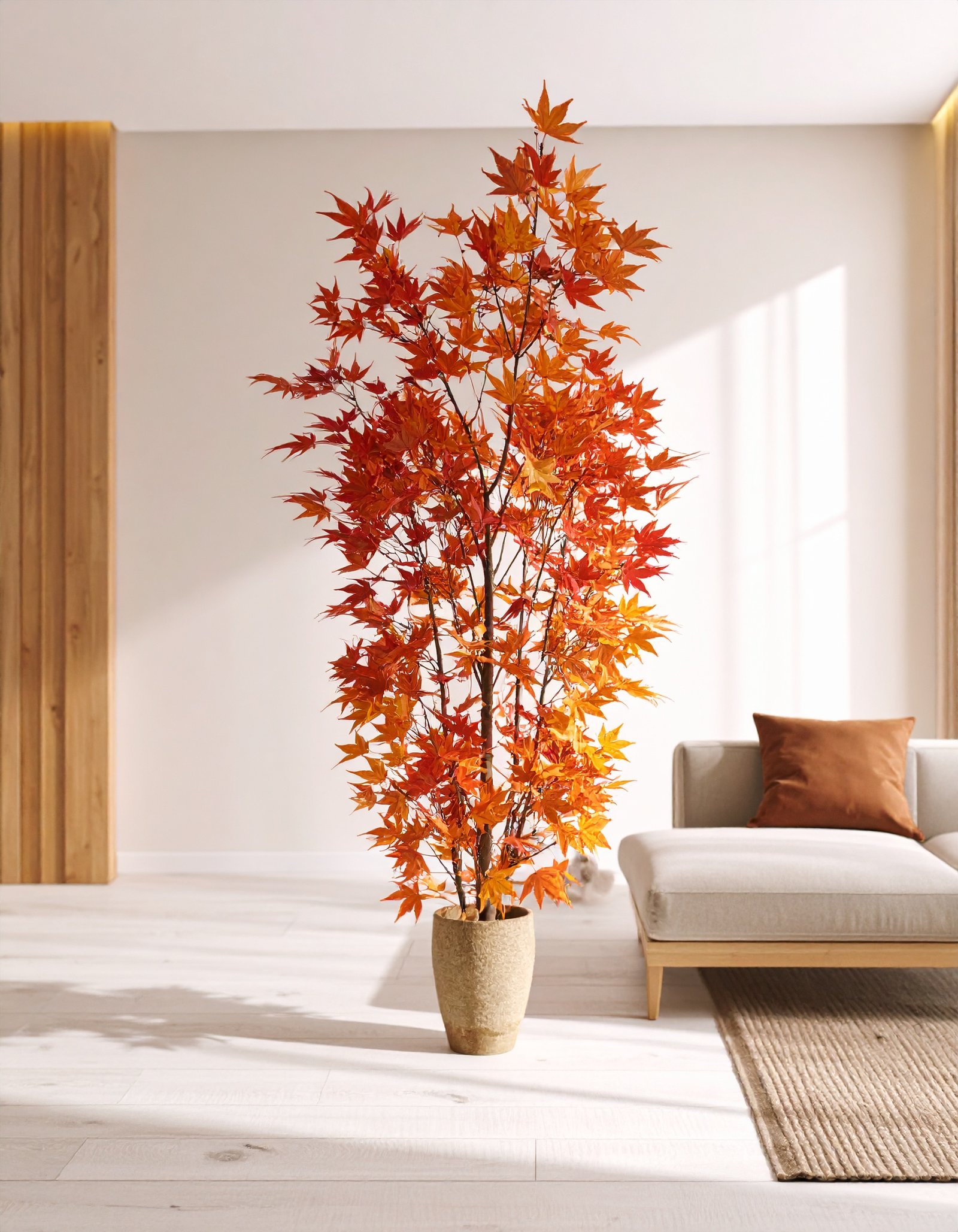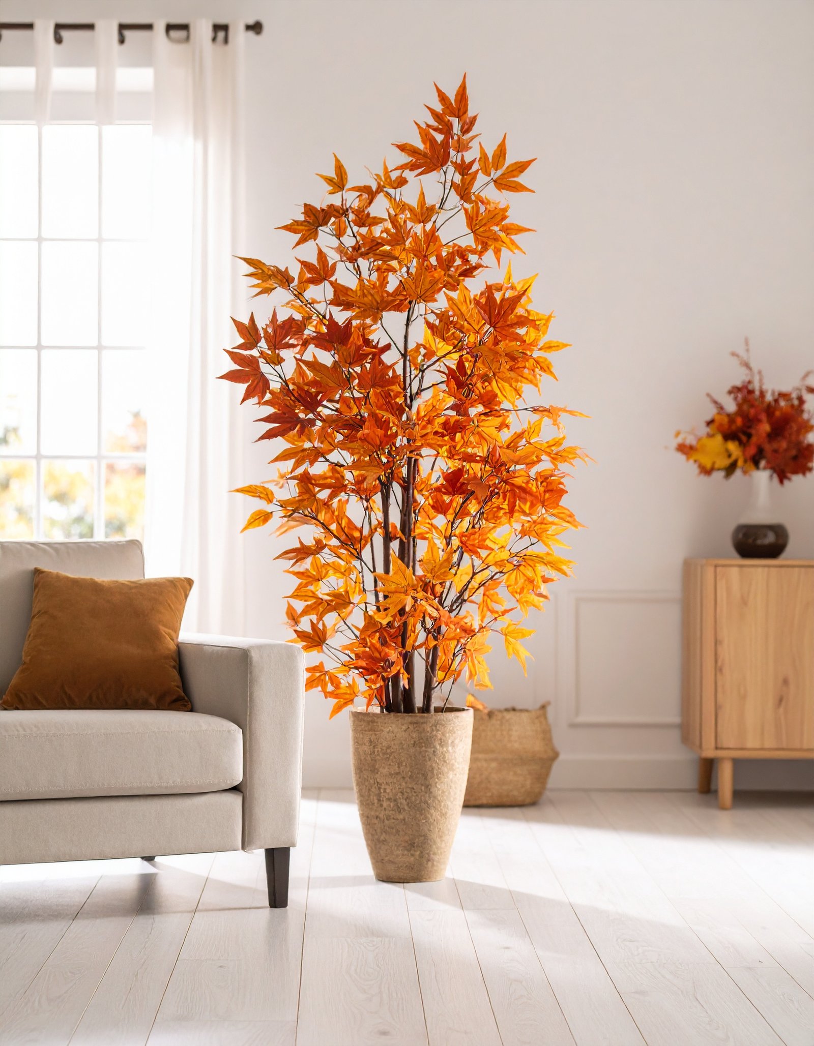 Celebrate the warmth of fall year-round with this 5 FT Autumn Japanese Maple Tree, featuring 121 real-touch leaves in rich seasonal tones—perfect for cozy, elegant spaces.