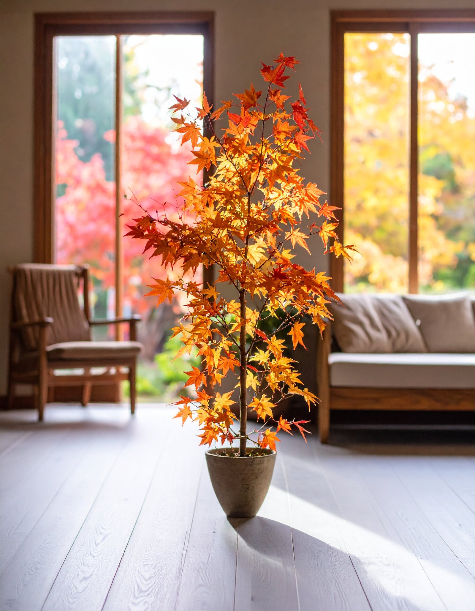 Bring home the stunning hues of fall with the 5 FT Autumn Japanese Maple Tree. This beautifully crafted artificial tree features 121 real-touch leaves in vibrant autumn shades—blending orange, red, and gold—to recreate the serene beauty of the season.