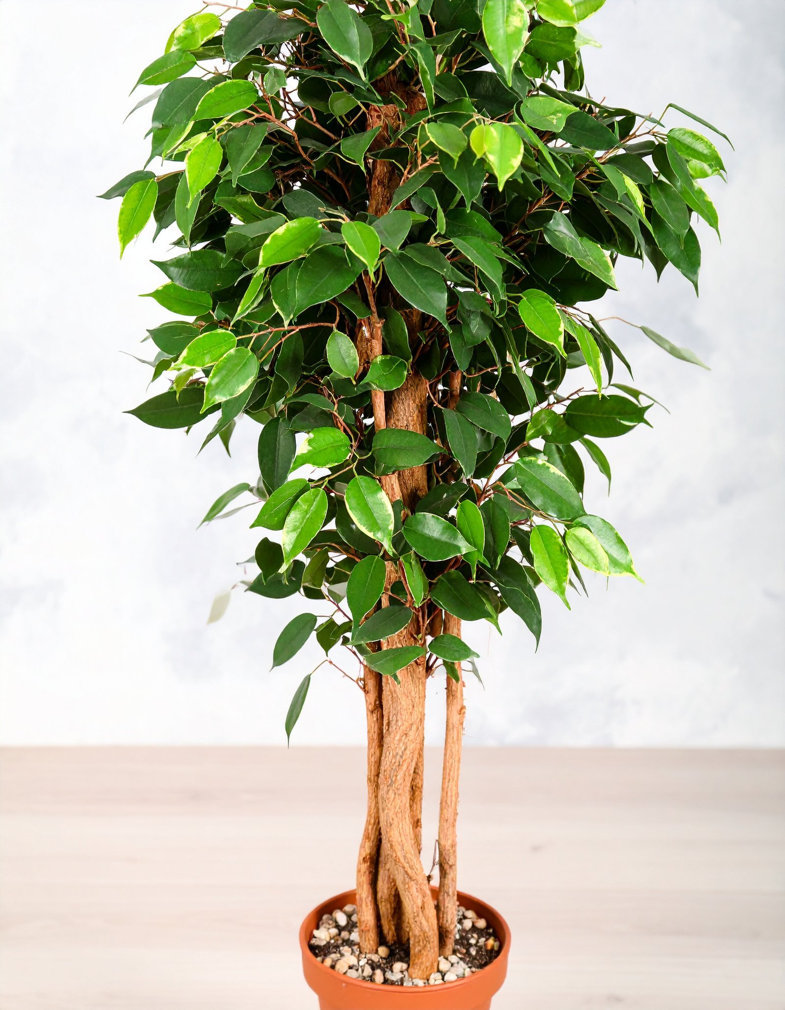 This 5 ft Ficus tree features a fibre trunk and 960 real-touch leaves, standing 150 cm tall. A perfect addition to any room, offering a realistic and vibrant green presence. Available in cartons of 4.