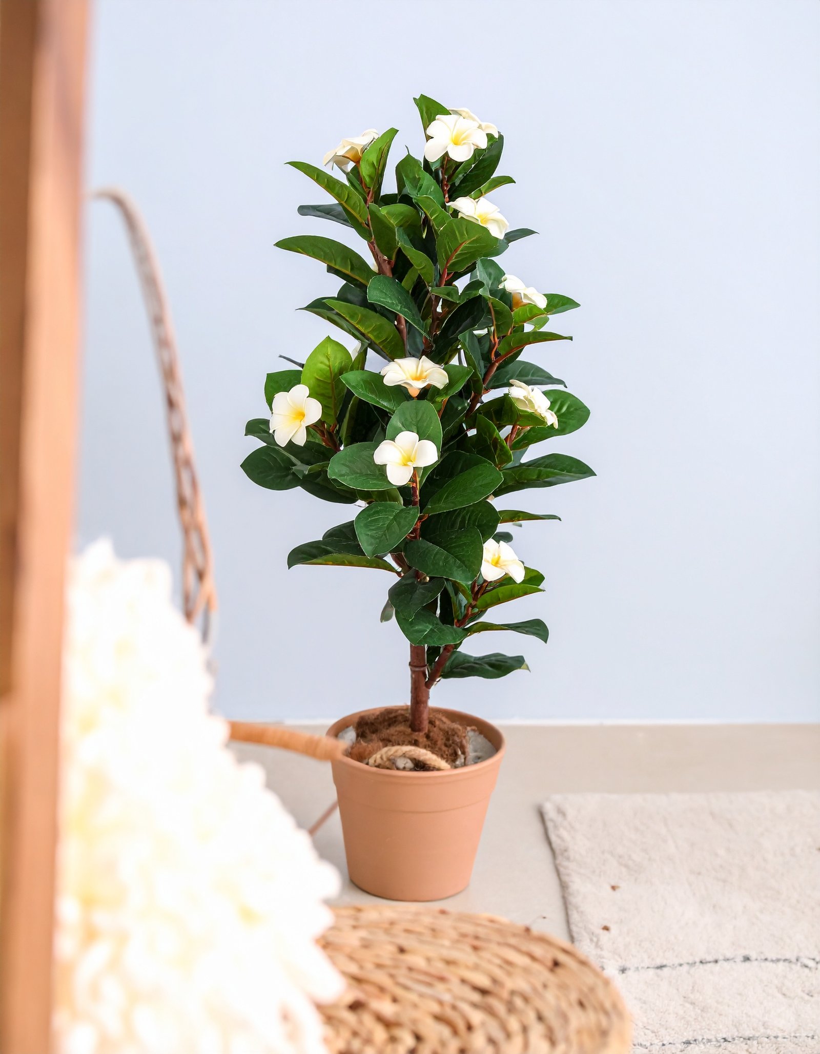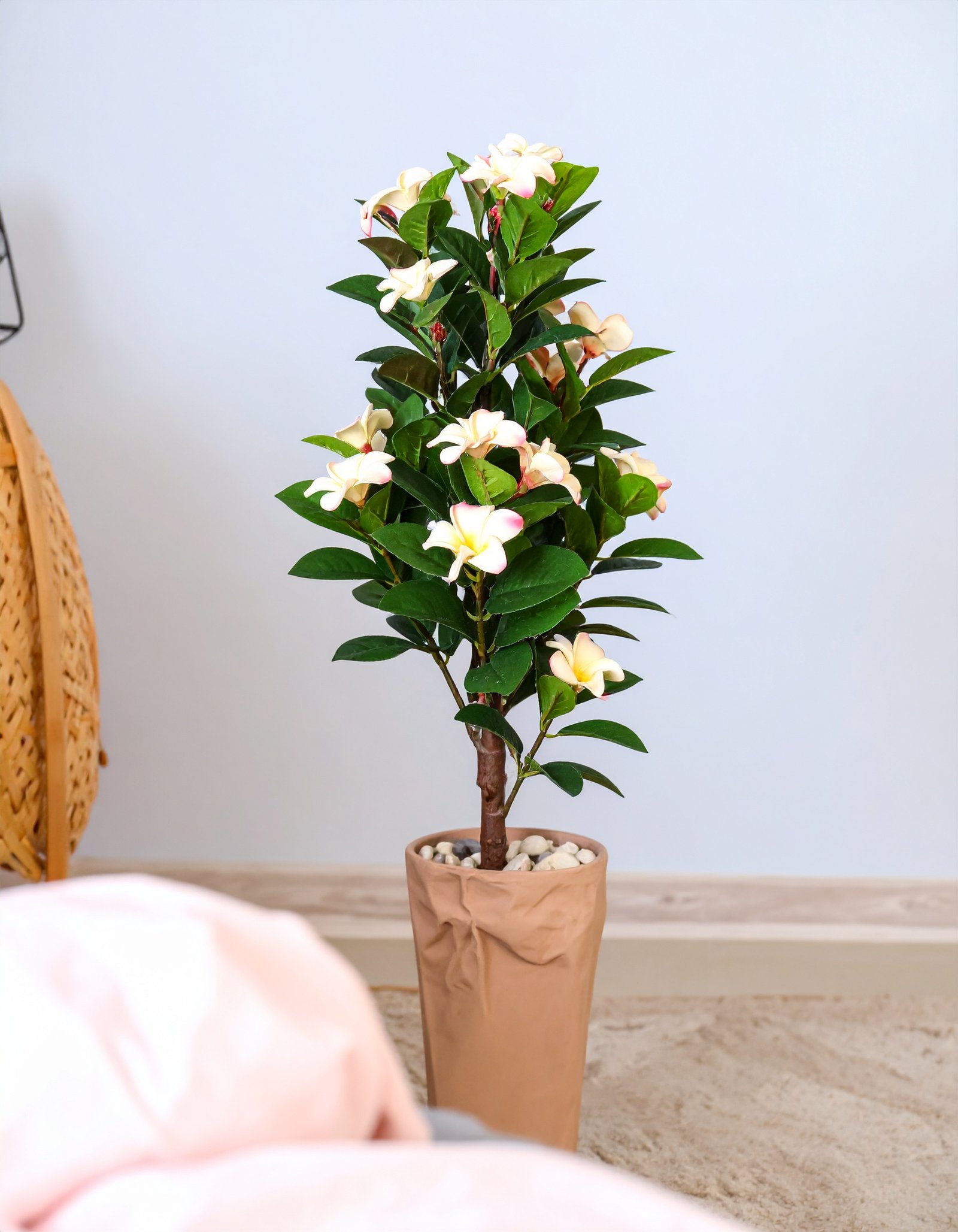 Gracefully designed with real-touch leaves and soft cream-hued Frangipani blossoms, this 5 FT (150 CM) tree is an elegant addition to your indoor or outdoor setup. The lifelike detailing on both the petals and foliage makes it ideal for living rooms, entryways, weddings, or resort-style spaces.
