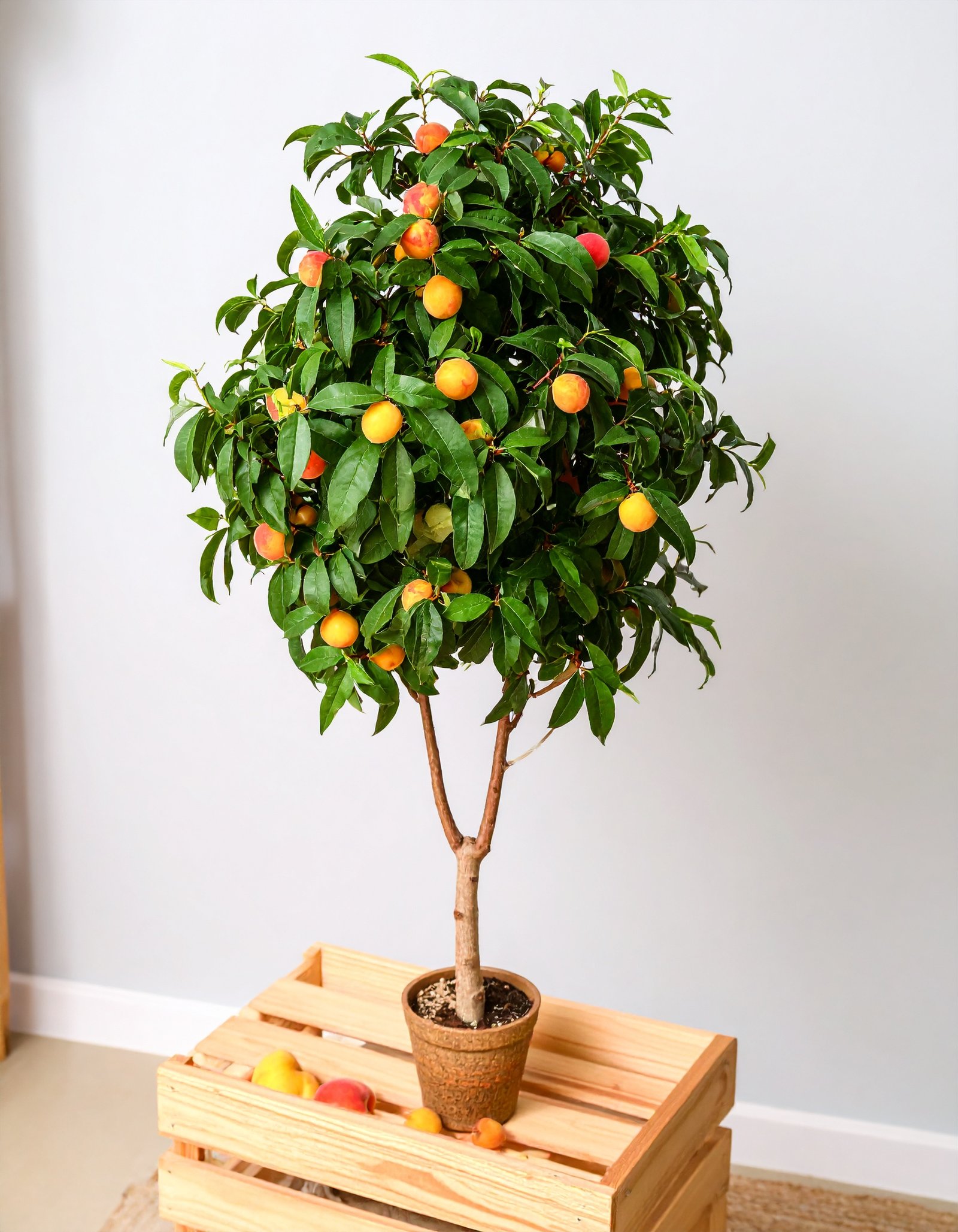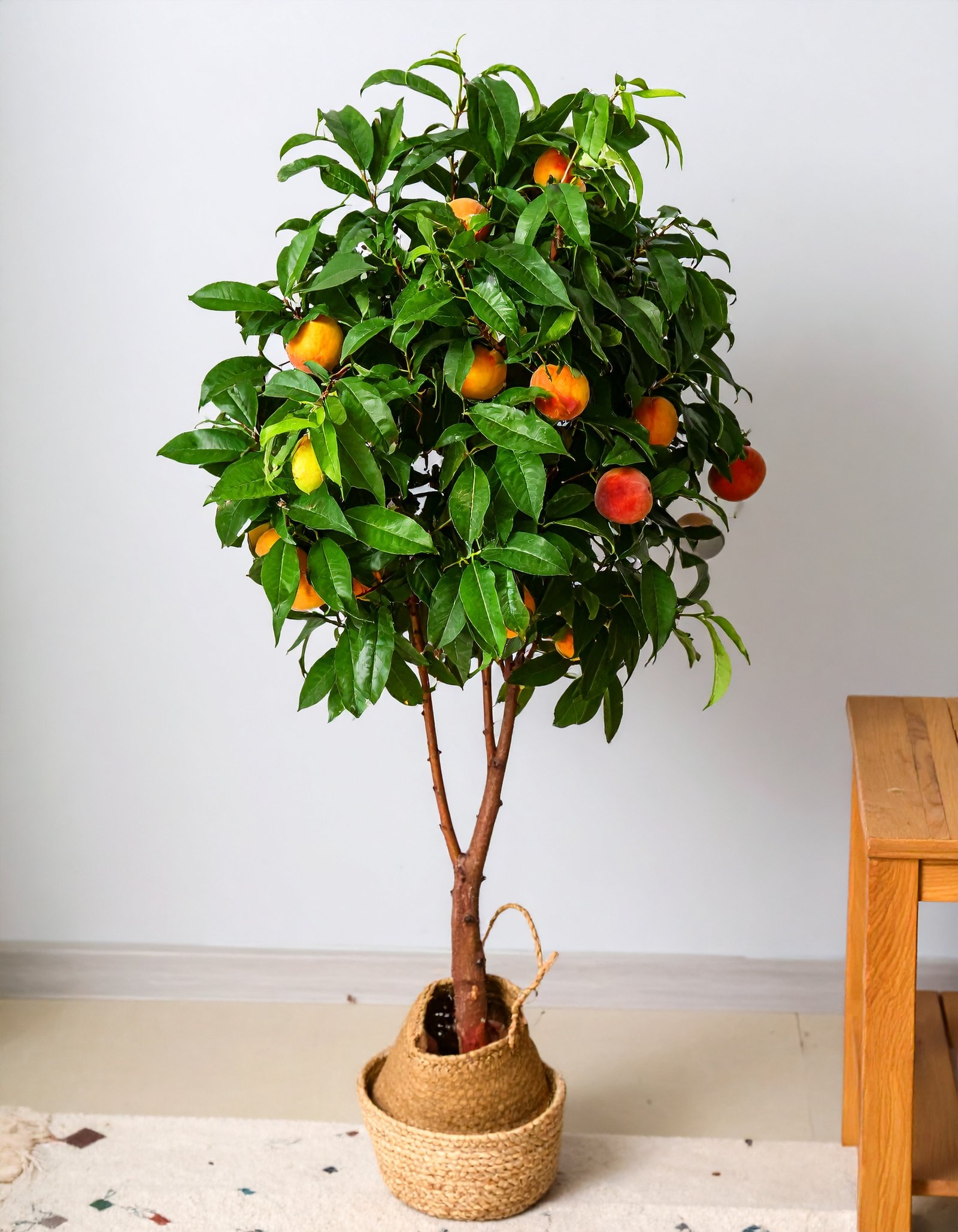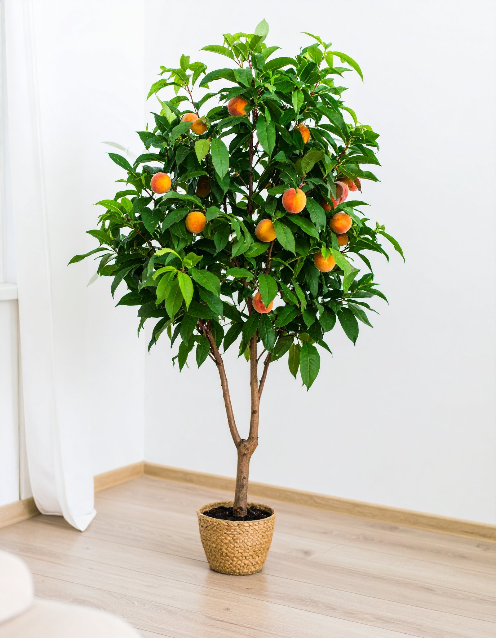 Make a statement with this life-size 6.5 Ft Peach Tree, featuring 1752 dense leaves and 33 realistic peaches. A stunning blend of color, realism, and grandeur for any indoor or outdoor setup.