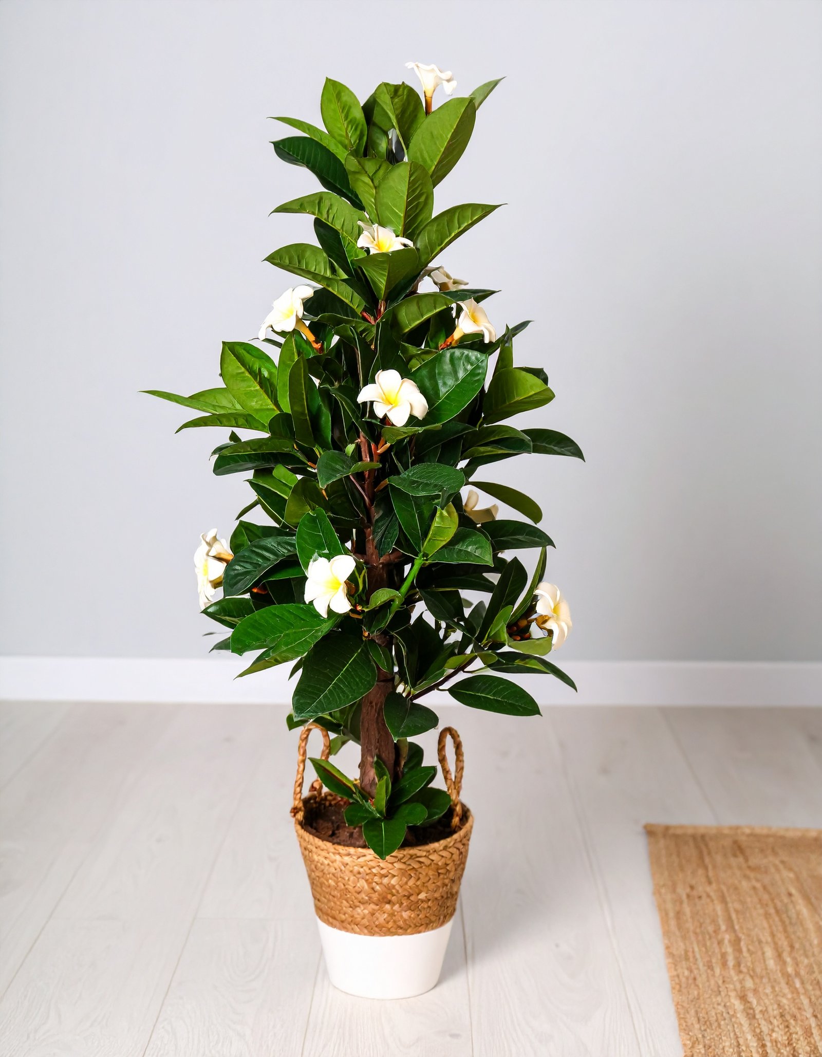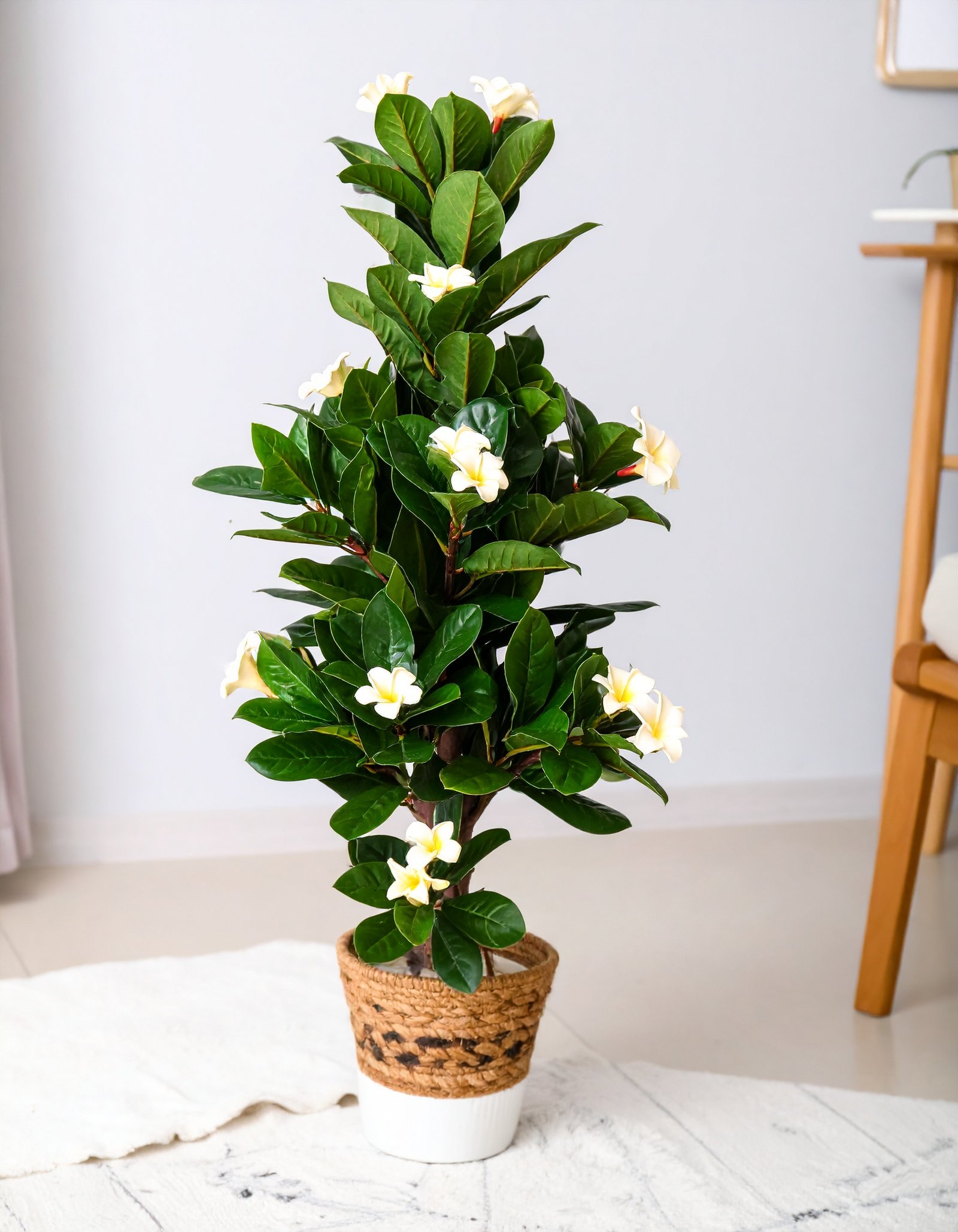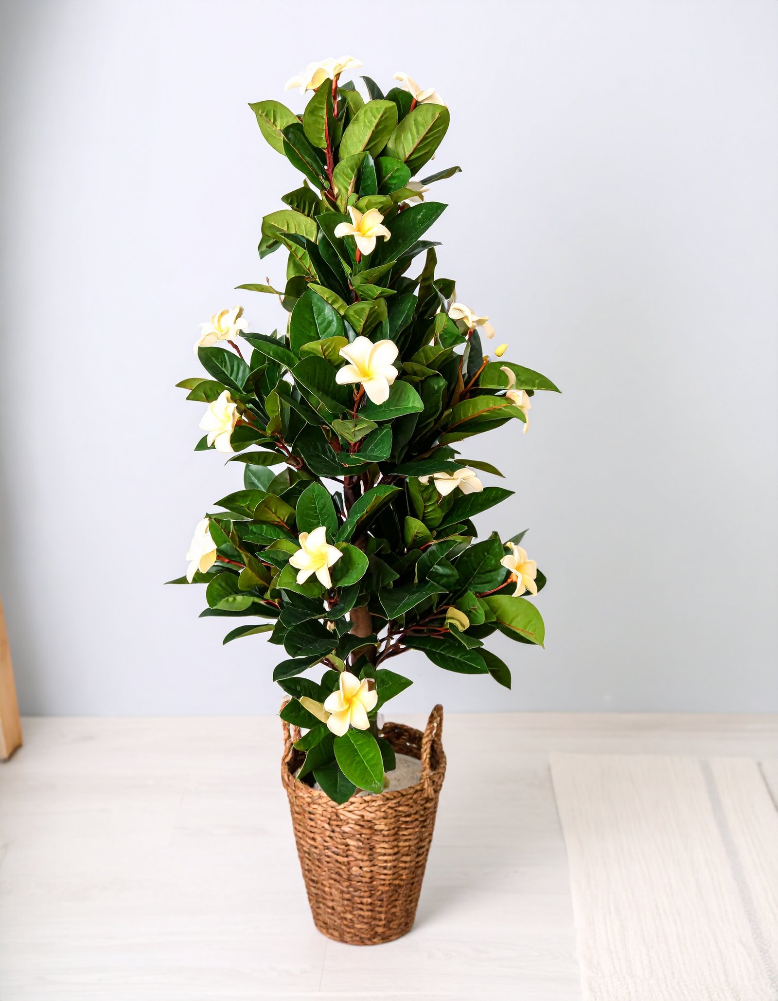 Bring home tropical serenity with this 6 Ft Frangipani Tree, featuring real-touch green foliage and elegant cream blossoms — a maintenance-free masterpiece for timeless interiors.