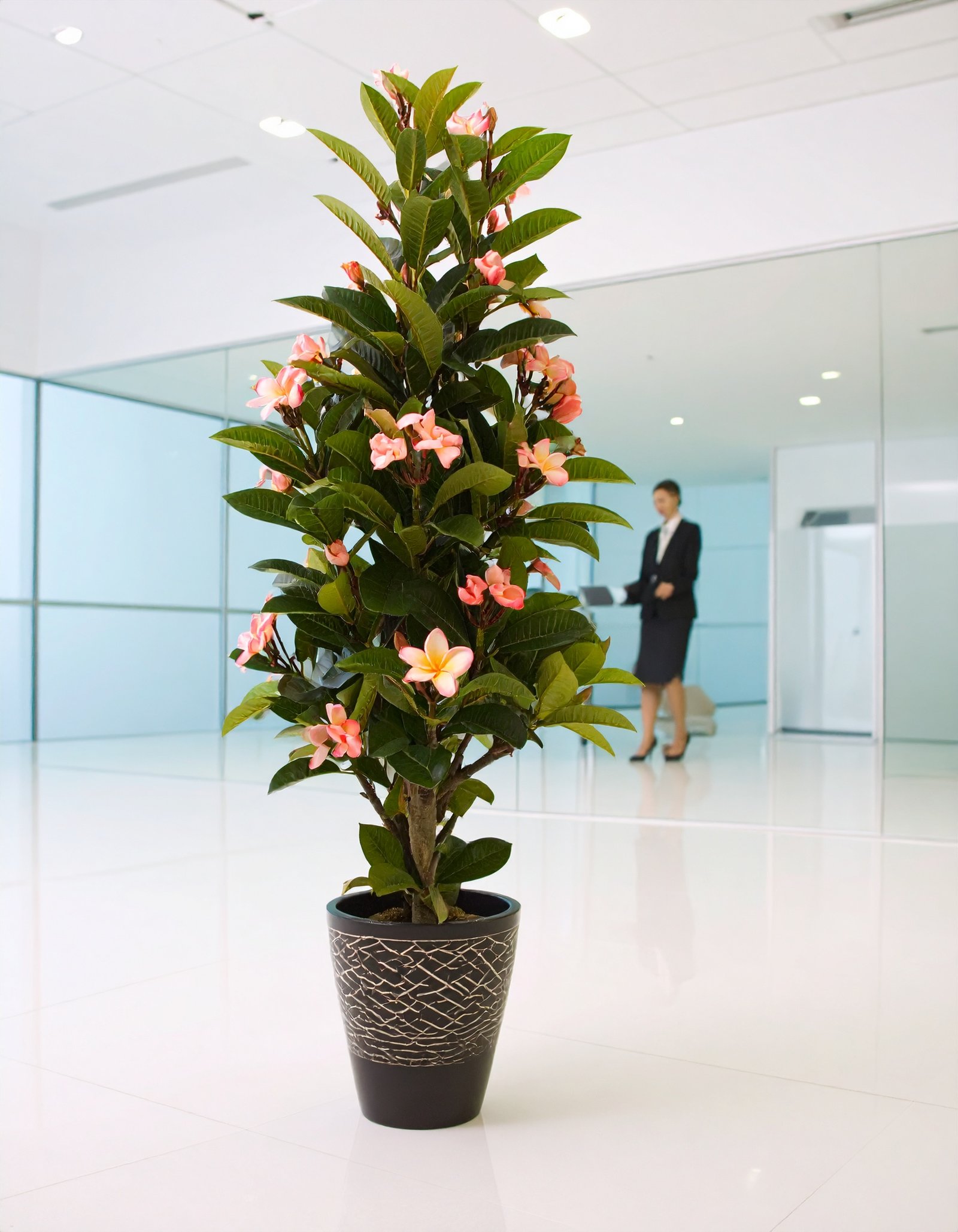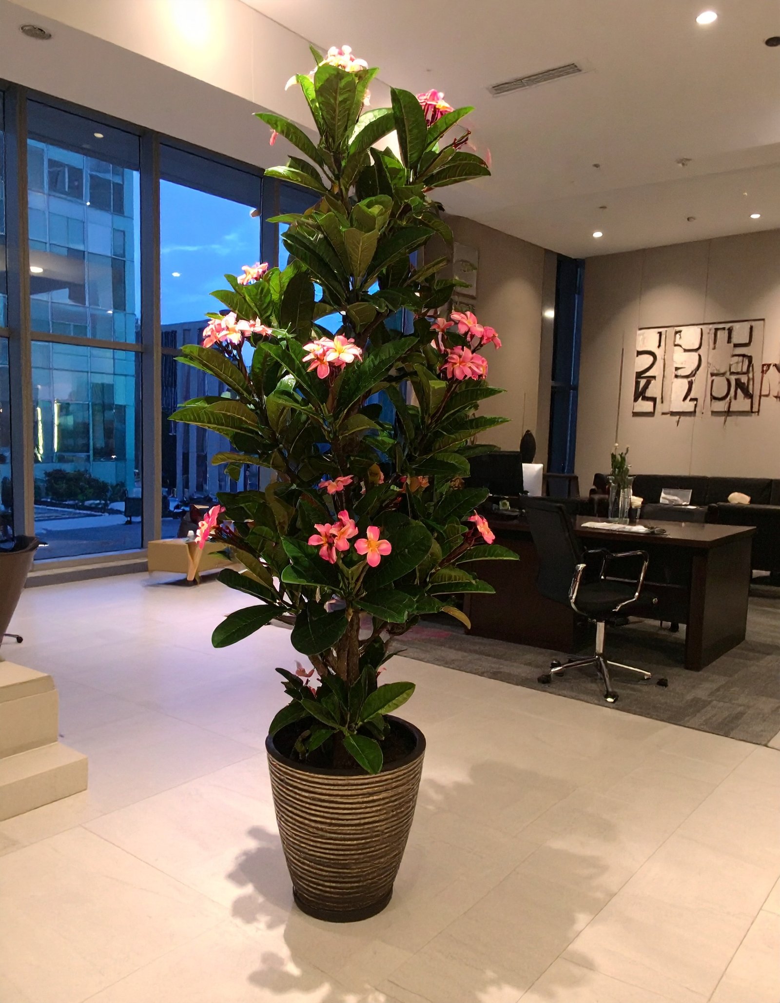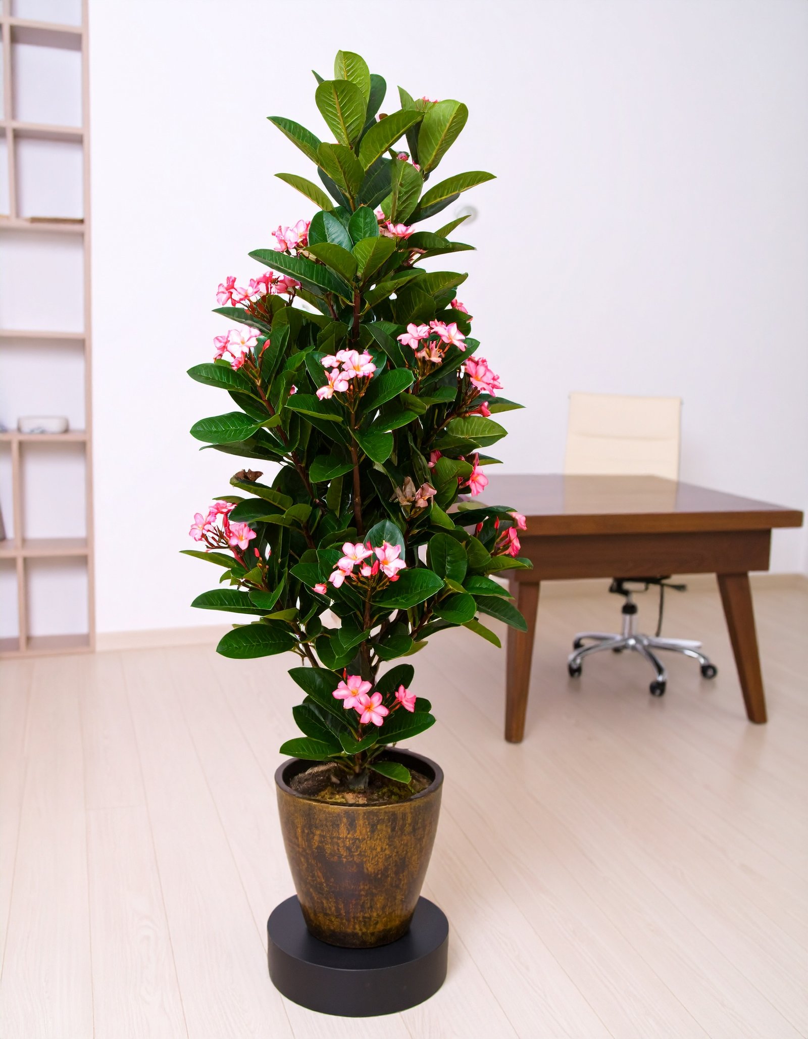 Crafted for realism, its lush green leaves and delicate pink flowers are intricately designed to mimic the look and feel of a real frangipani tree. The sturdy trunk adds natural appeal, while the maintenance-free design ensures your space stays vibrant and serene all year long.