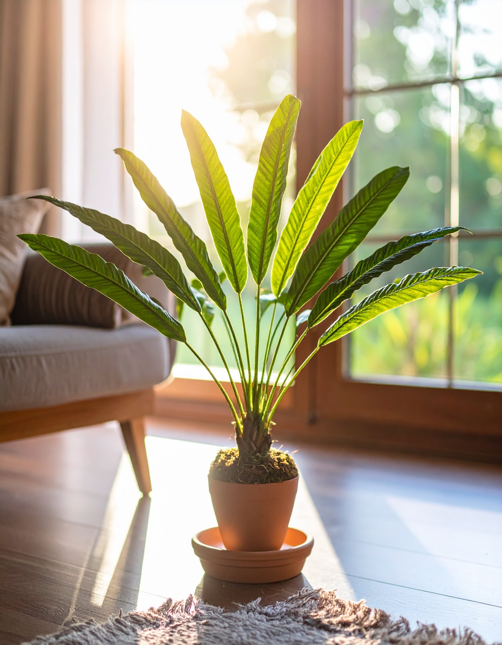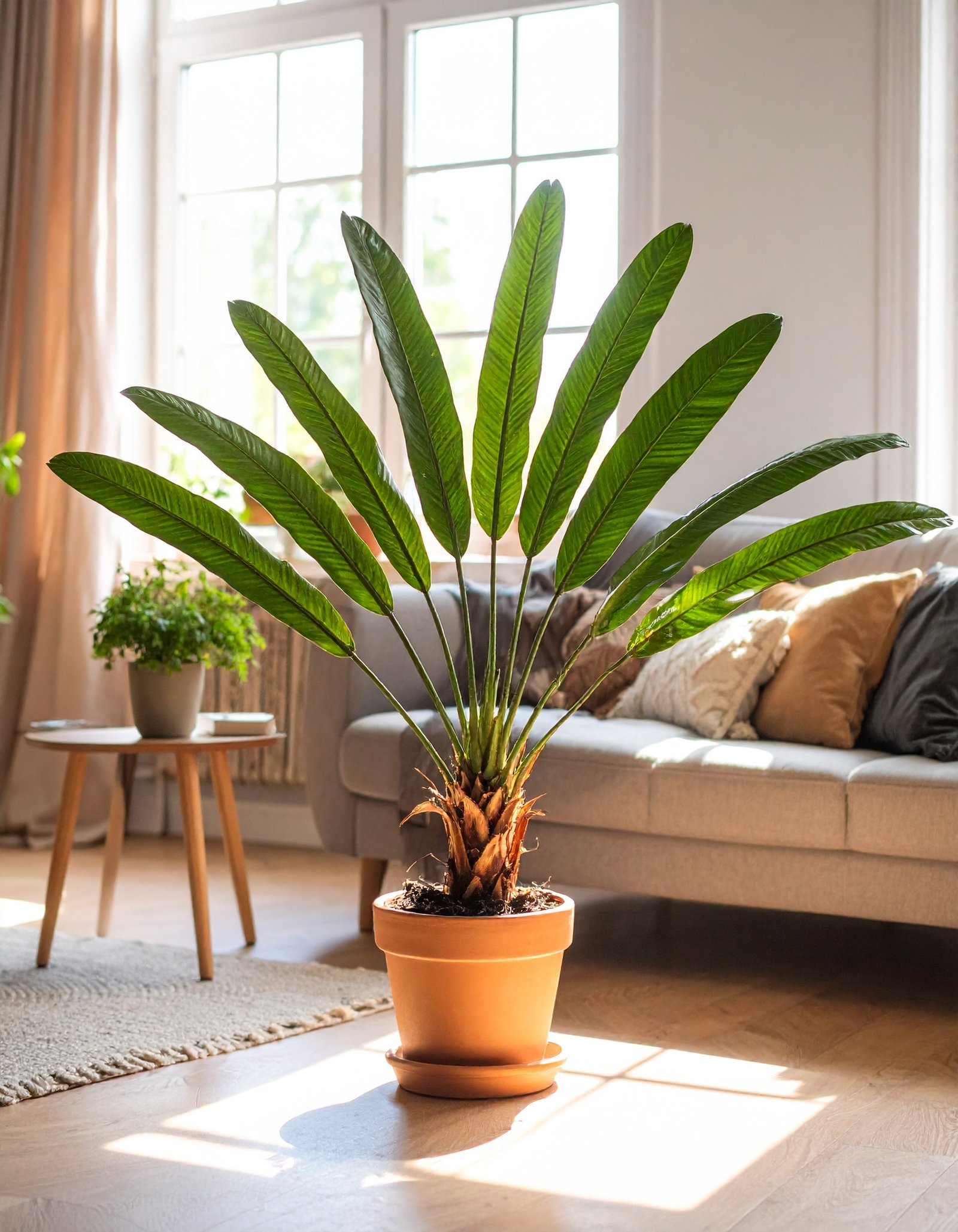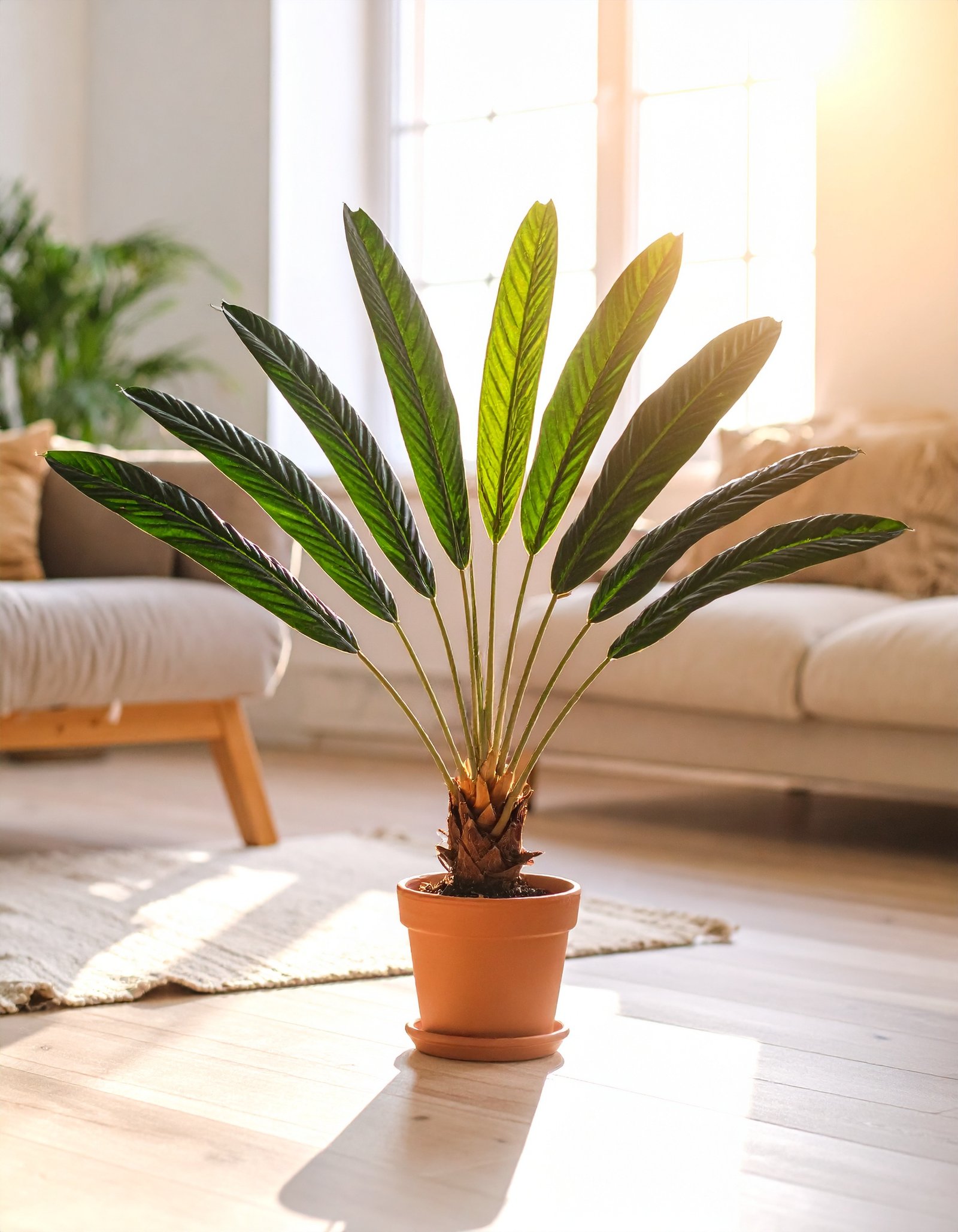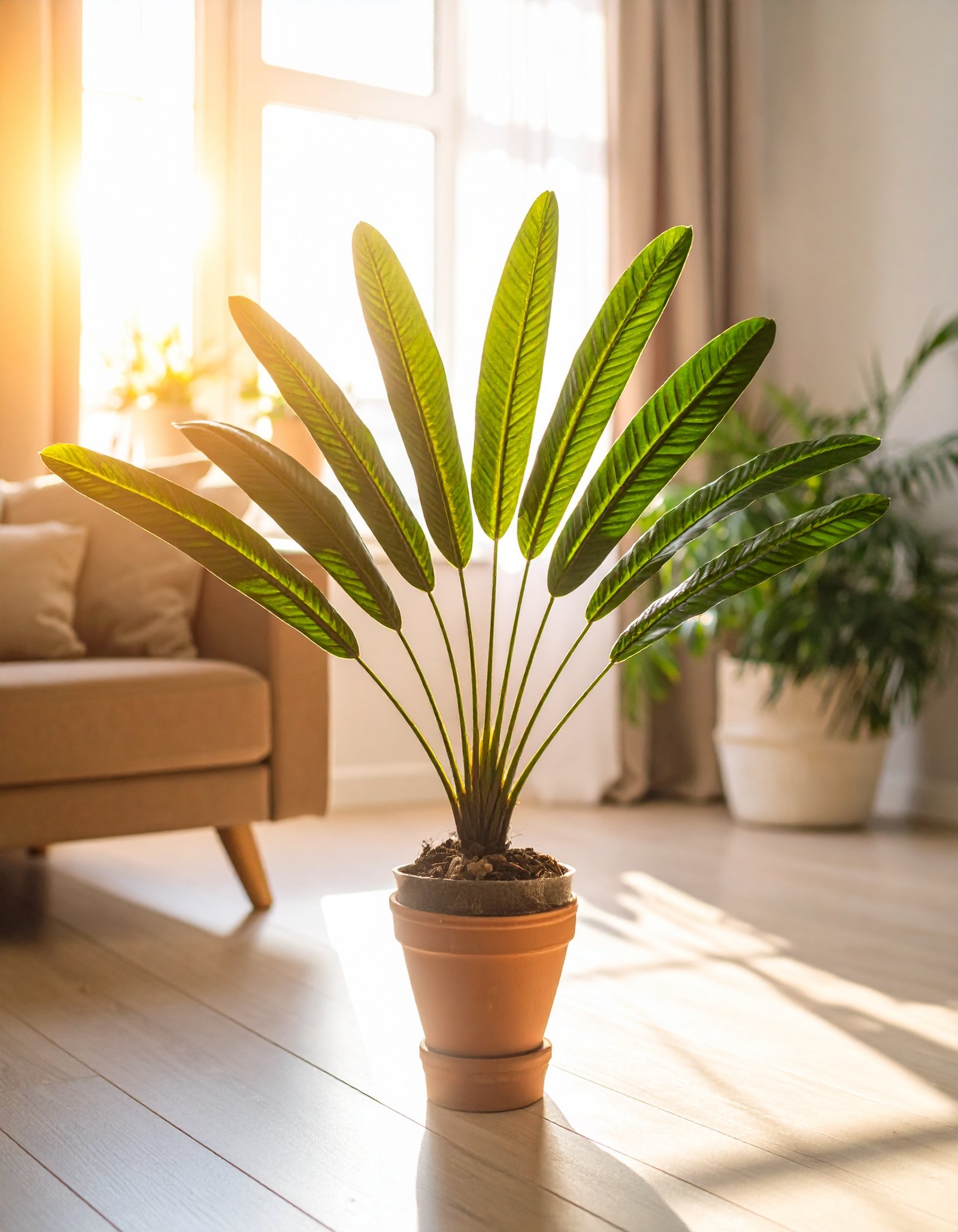 Its compact 2-foot height makes it an ideal fit for tabletops, sideboards, reception counters, or work desks, delivering tropical elegance without occupying much space. Designed to complement modern homes, cafés, offices, and retail interiors, this plant brings a calming, green presence to any environment.
