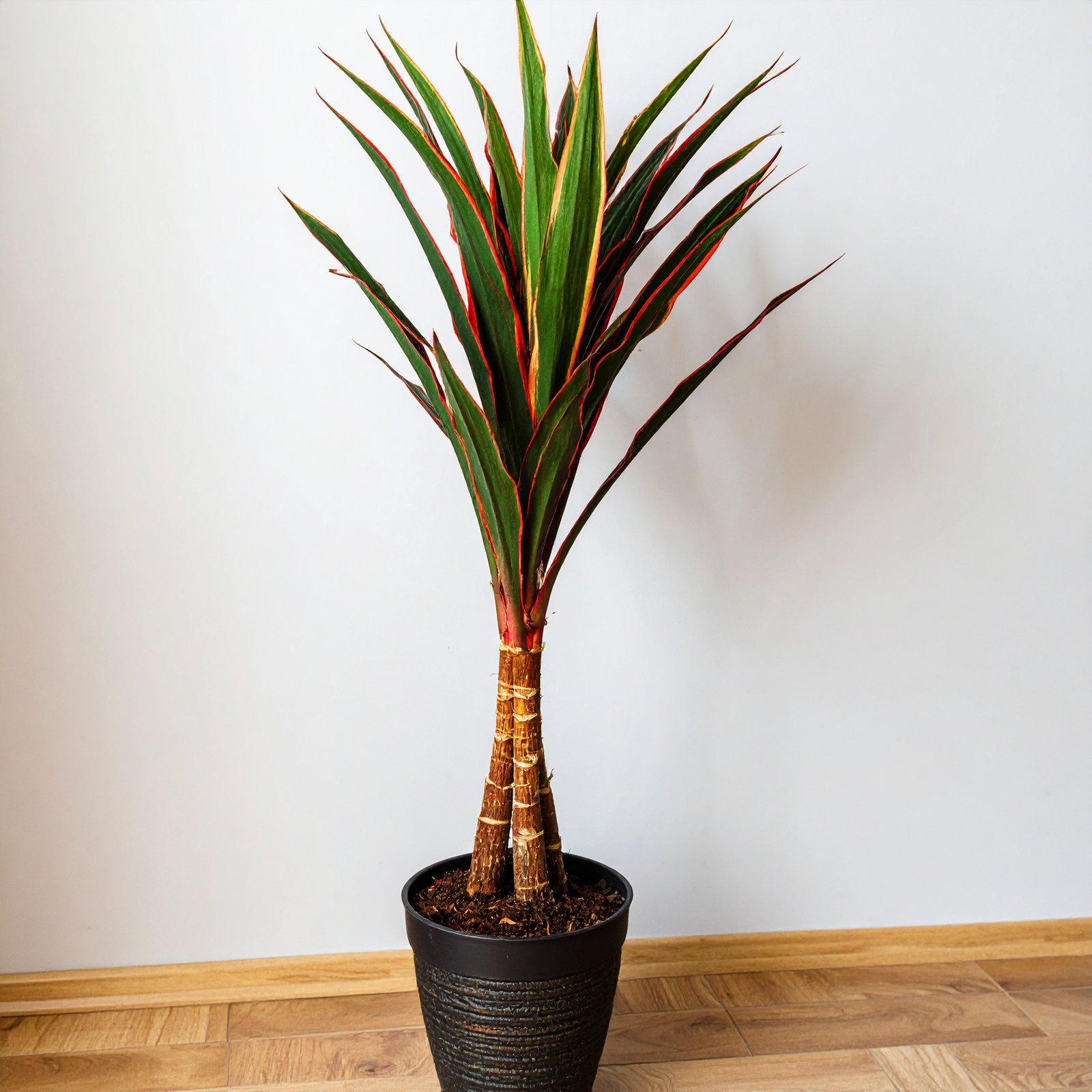 It features three expertly crafted fibre trunks for a full, structured base, supporting a spread of lush Real Touch leaves in vibrant green with bold red accents. The result is a visually captivating plant that mimics the natural dracaena while adding a dramatic color contrast—perfect for modern homes, corporate lobbies, hotel interiors, showrooms, and event spaces.